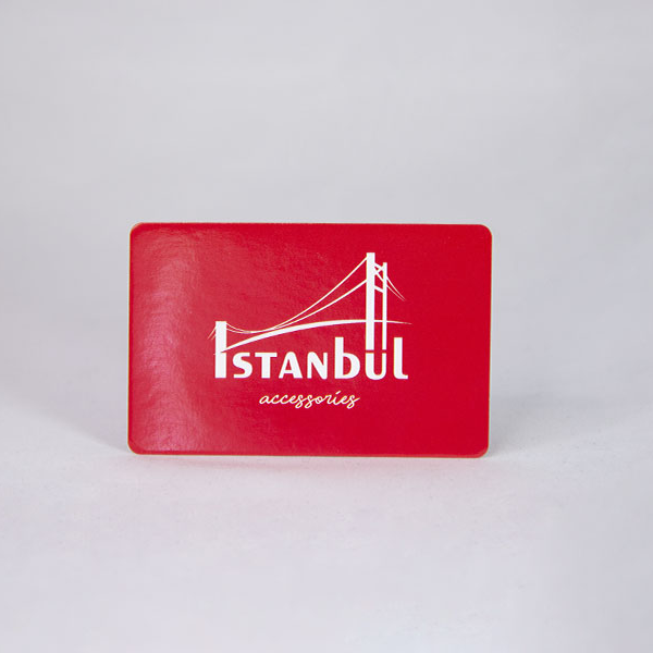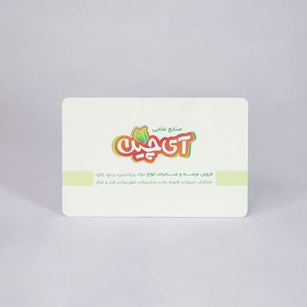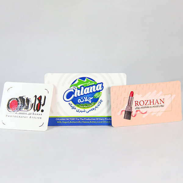 بطاقة أعمال مغلّفة بالسلوفان اللامع، مطبوعة على الوجهين، بحواف دائرية